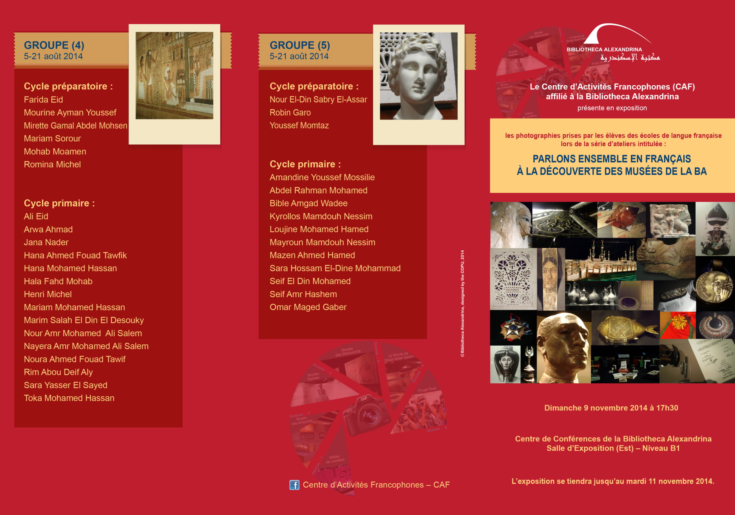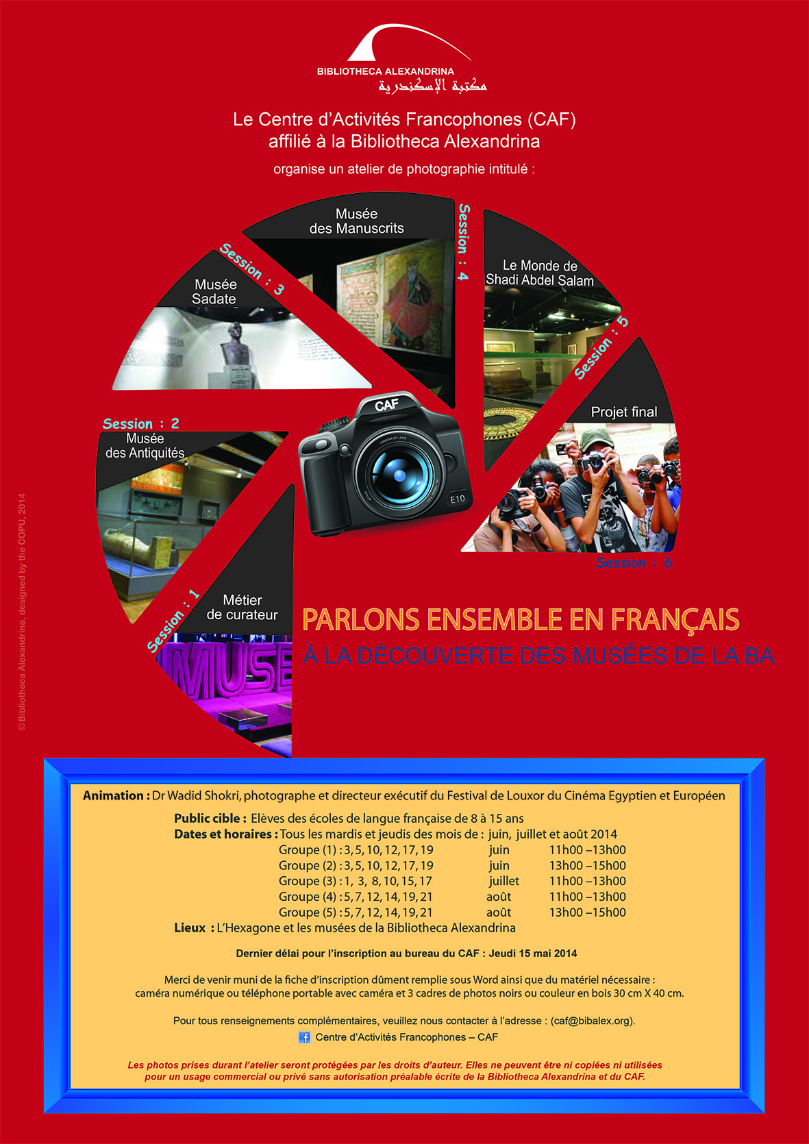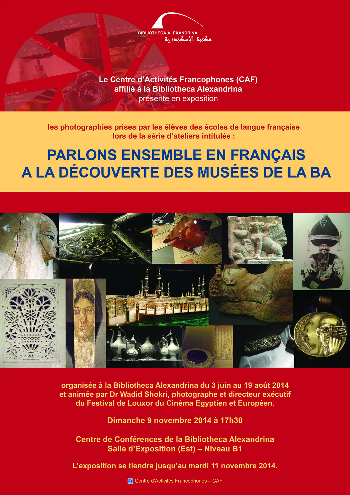 Le Centre d’Activités Francophones (CAF) affilié à la Bibliotheca Alexandrina présente en exposition les photographies prises par les élèves des écoles de langue française lors de la série d’ateliers intitulée « Parlons ensemble en français : A la découverte des musées de la BA », organisée à la Bibliotheca Alexandrina du 3 juin au 19 août 2014 et animée par Dr Wadid Shokri, photographe et directeur exécutif du Festival de Louxor du Cinéma Egyptien et Européen.