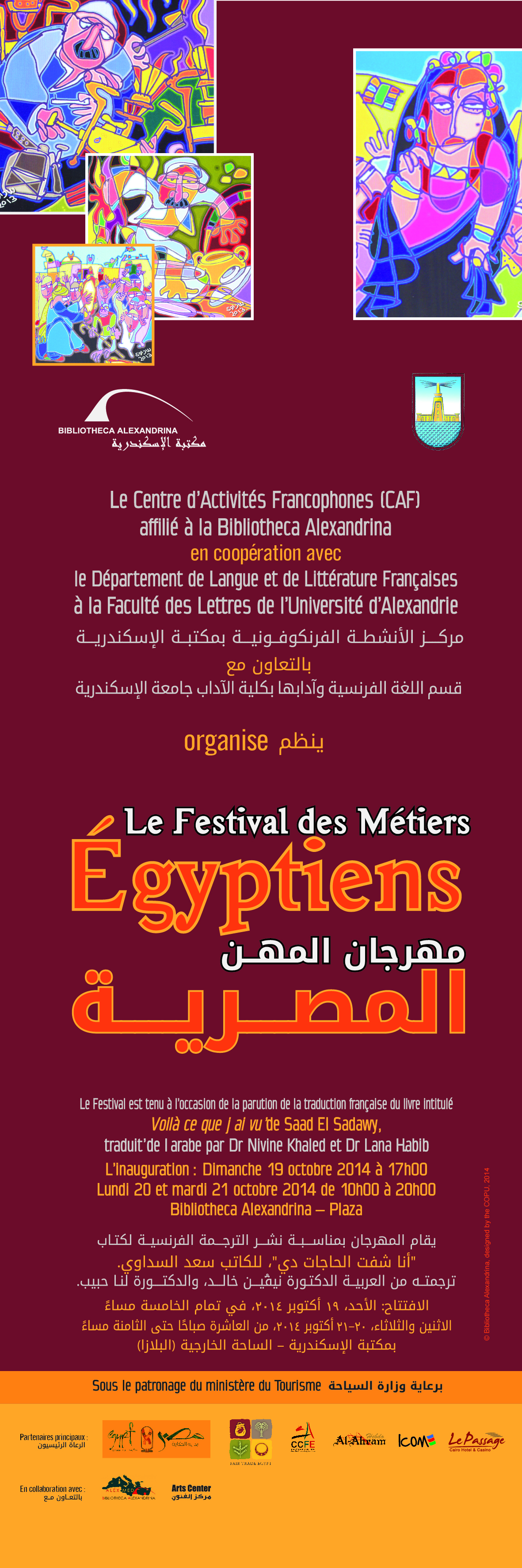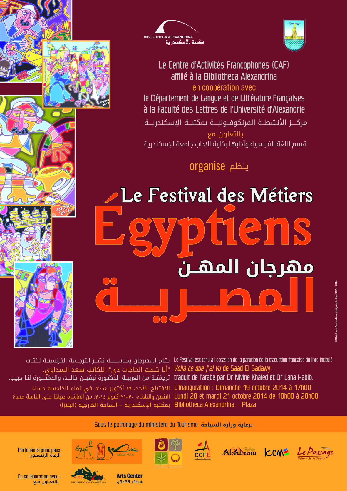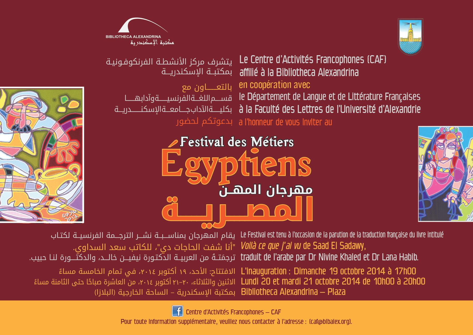 Le Centre d’Activités Francophones (CAF) affilié à la Bibliotheca Alexandrina en coopération avec le Département de Langue et de Littérature Françaises à la Faculté des Lettres de l'Université d’Alexandrie, organise « Le Festival des Métiers Égyptiens » à l’occasion de la parution de la traduction française du livre intitulé « Voilà ce que j’ai vu » de Saad El Sadawy, traduit de l’arabe par Dr Nivine Khaled et Dr Lana Habib.