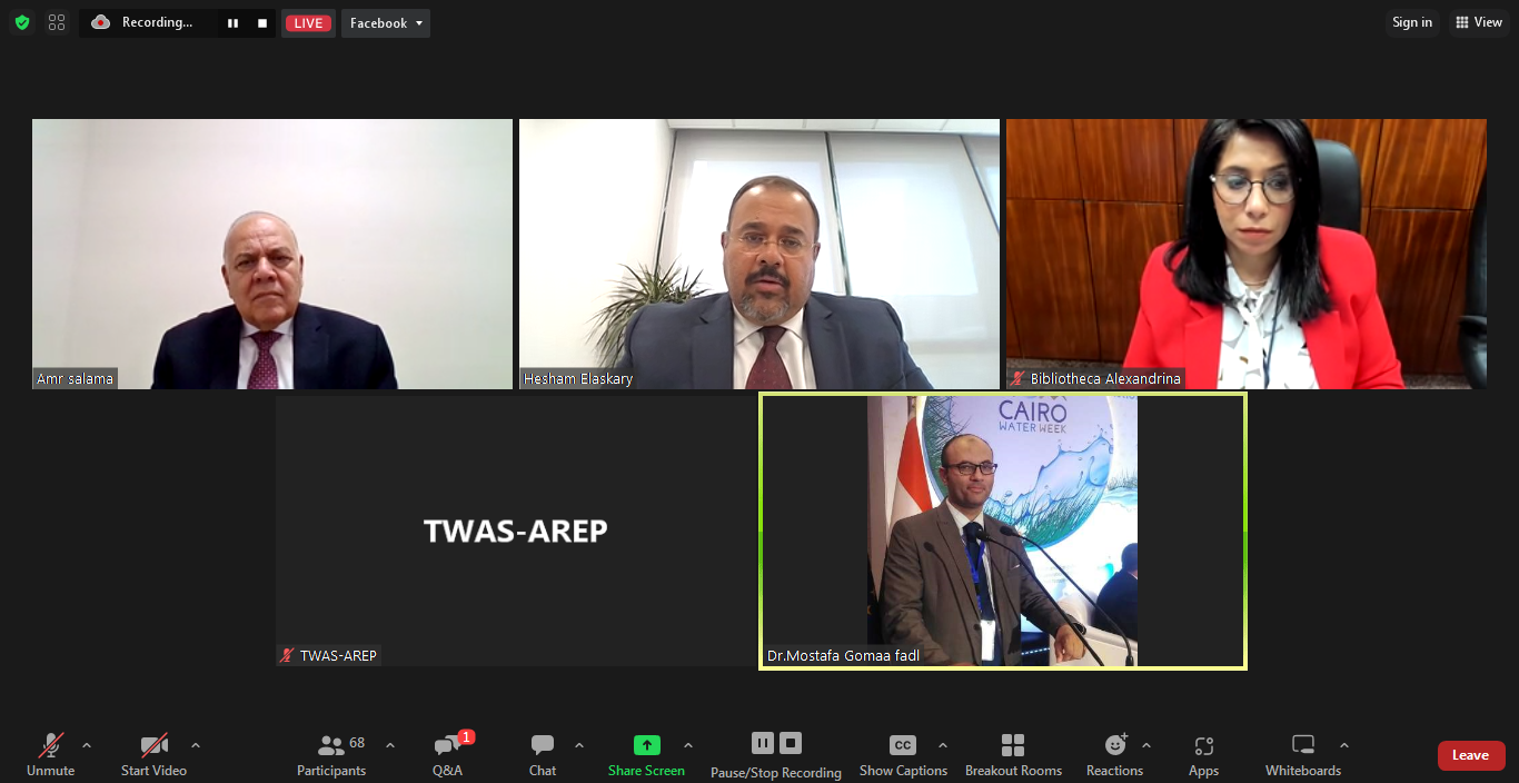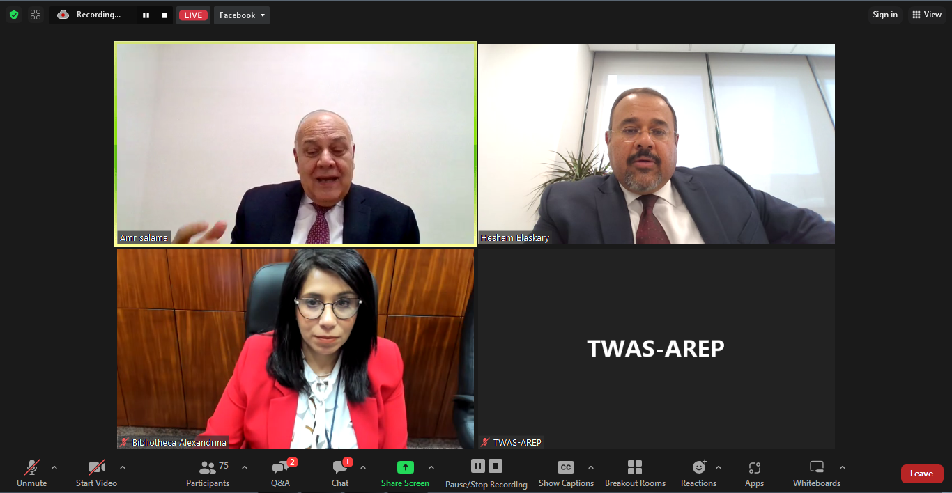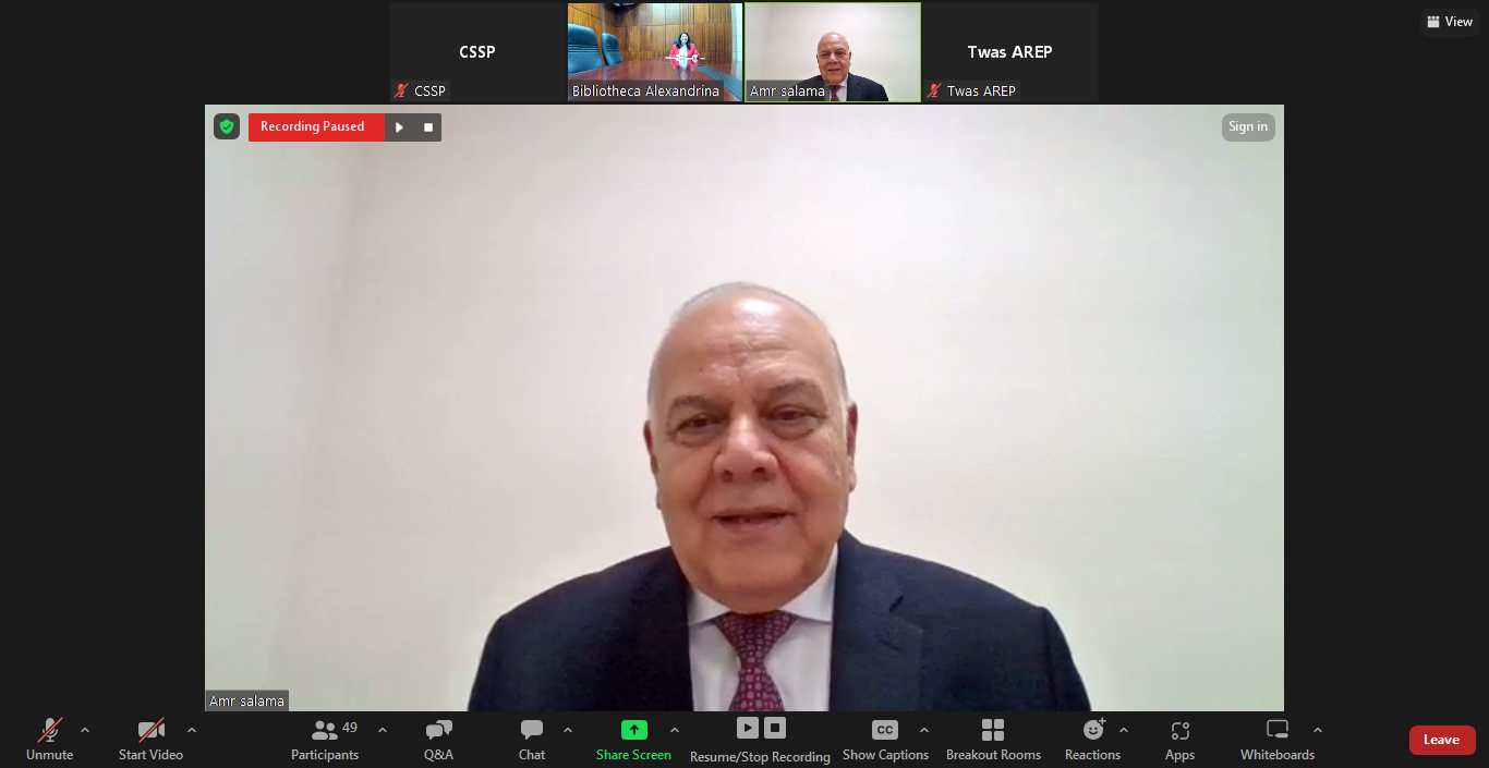 The Bibliotheca Alexandrina (BA), through the Center for Special Studies and Programs (CSSP) and The World Academy of Sciences for the Advancement of Science in Developing Countries’ Arab Regional Partner (TWAS–AREP) organized an online lecture titled “On the Interplay of Data Sciences and Earth Observation Addressing Environmental Challenges in the Arab Region”; by Prof. Hesham ElAskary, Professor of Remote Sensing and Earth System Science, Schmid College of Science and Technology (USA). The lecture was moderated by H.E. Prof. Amr Ezzat Salama, Former Minister of Higher Education and Scientific Research, on Monday, 27 November 2023, 12:00 noon (Cairo time).