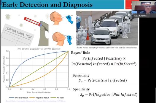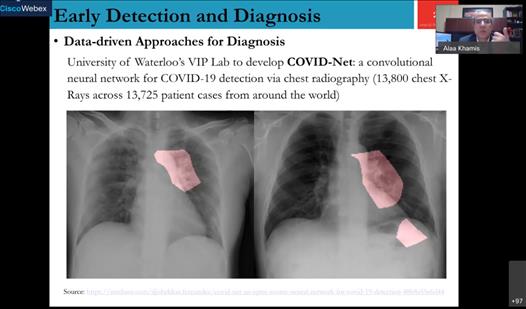The webinar highlighted the many roles AI technologies play in fighting the New Coronavirus (COVID-19) pandemic and the resources available in this area to deal with the effects of the pandemic. Potential applications of AI in this accelerating pandemic include, but are not limited to, early detection and diagnosis, massive agent modeling and simulation, data analytics, assistive robots, disinfection robots, public awareness and patrolling, contactless last-mile delivery services, virtual healthcare assistants (chatbots) and drug repurposing/discovery and vaccine development. This talk highlights a number of potential applications to transform this challenge into opportunities. The speaker also presented general information on artificial intelligence types and characteristics, and how it is compared to natural or human intelligence.