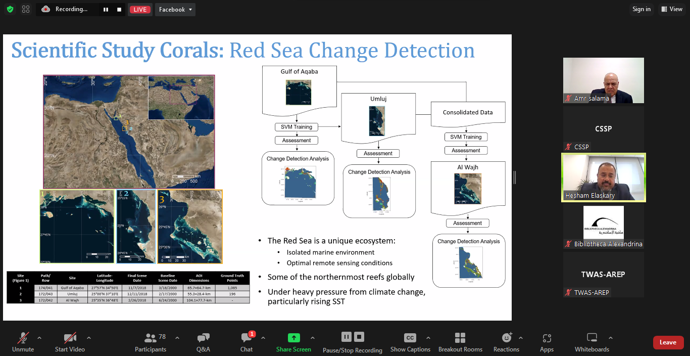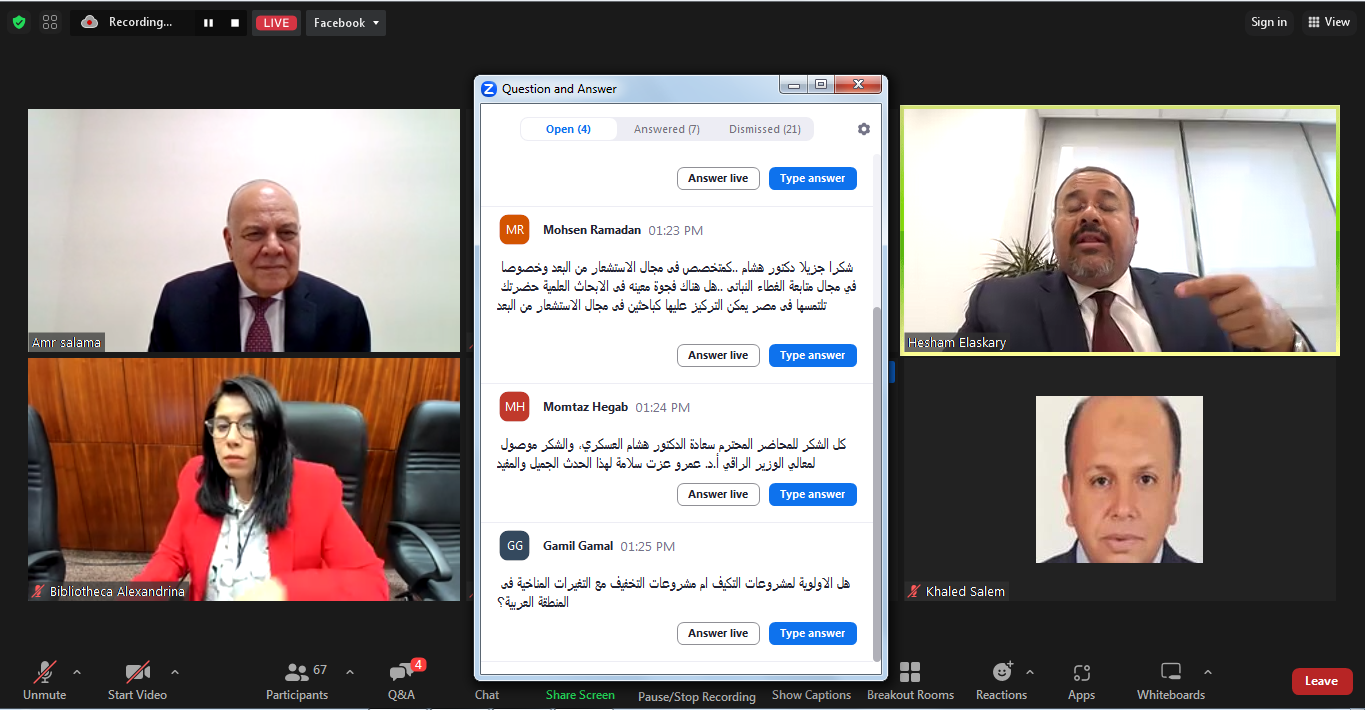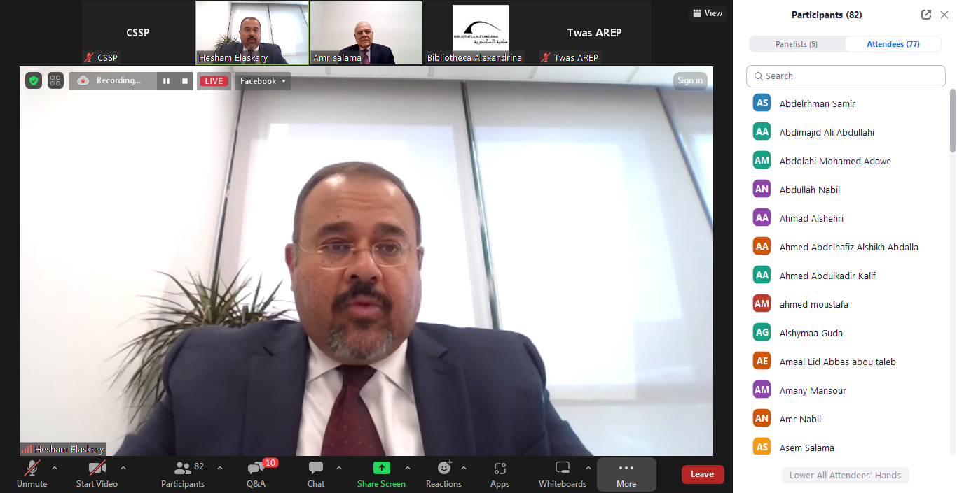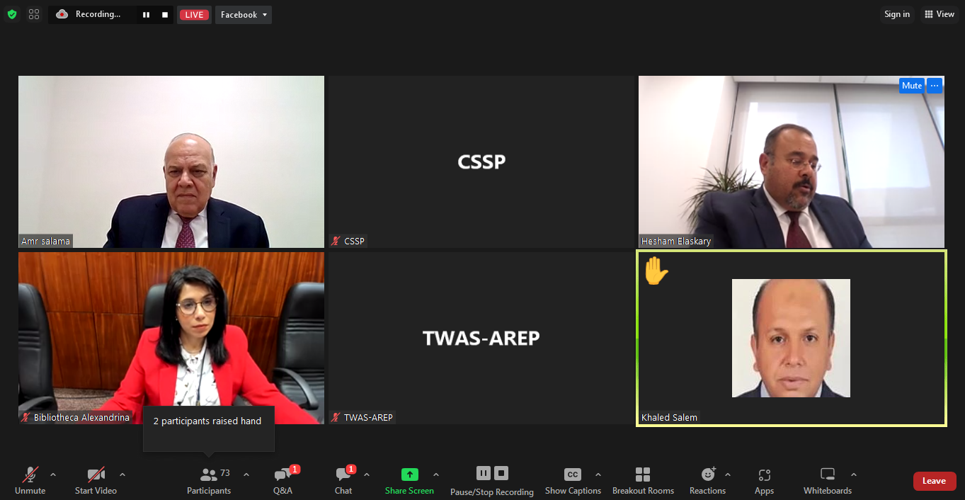 The Bibliotheca Alexandrina (BA), through the Center for Special Studies and Programs (CSSP) and The World Academy of Sciences for the Advancement of Science in Developing Countries’ Arab Regional Partner (TWAS–AREP) organized an online lecture titled “On the Interplay of Data Sciences and Earth Observation Addressing Environmental Challenges in the Arab Region”; by Prof. Hesham ElAskary, Professor of Remote Sensing and Earth System Science, Schmid College of Science and Technology (USA). The lecture was moderated by H.E. Prof. Amr Ezzat Salama, Former Minister of Higher Education and Scientific Research, on Monday, 27 November 2023, 12:00 noon (Cairo time).