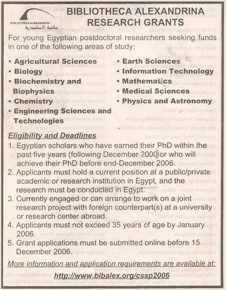 More than 220 young Egyptian postdoctoral researchers in the fields of Agricultural Sciences, Biology, Biochemistry and Biophysics, Chemistry, Engineering Sciences and Technologies, Earth Sciences, Information Technology, Mathematics, Medical Sciences and Physics& Astronomy have applied for the BA Research Grants offered annually to young Egyptian postdoctoral researchers by the Bibliotheca Alexandrina.