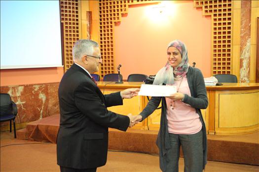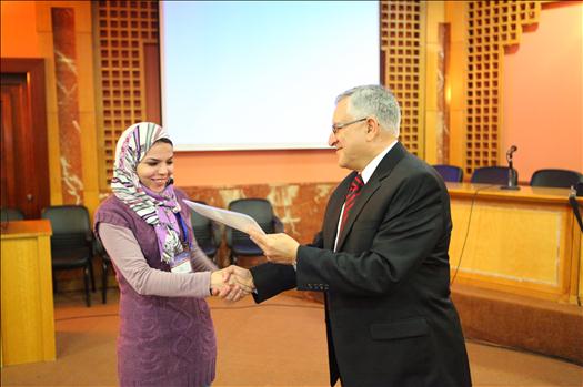 Prof. Mohamed El-Sharkawi, Workshop trainer, along with Ms. Nahla Kandil, Workshop participant, during the certificates distribution ceremony