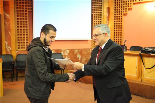 Prof. Mohamed El-Sharkawi, Workshop trainer, along with Mr. Moustafa Samir, Workshop participant, during the certificates distribution ceremony