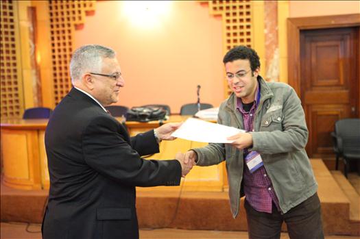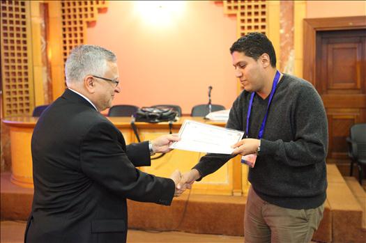 Prof. Mohamed El-Sharkawi, Workshop trainer, along with Mr. Omar Fathi, Workshop participant, during the certificates distribution ceremony