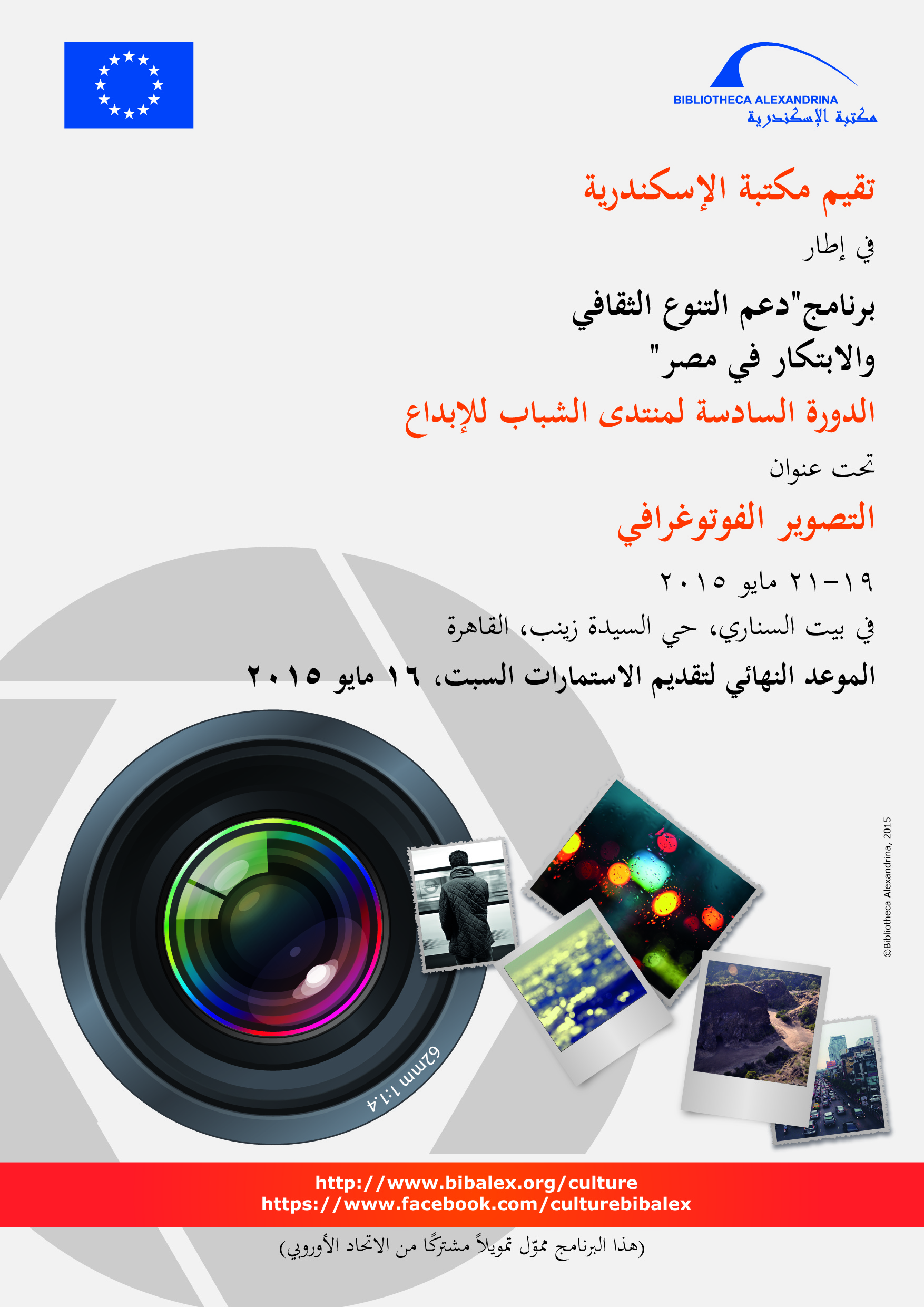 وتنظم مكتبة الإسكندرية الدورة السادسة لمنتدى الشباب للإبداع حول موضوع "التصوير الفوتوغرافي"، وتستمر فعاليات الدورة على مدار ثلاثة أيام، تبدأ من 19 حتى21 مايو 2015.