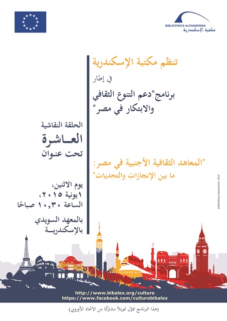 تقيم مكتبة الإسكندرية حلقة نقاشية جديدة تحت عنوان "المعاهد الثقافية الأجنبية في مصر: ما بين الإنجازات والتحديات"، وذلك في إطار برنامج "دعم التنوع الثقافي والابتكار في مصر"، والممول تمويلاً مشتركاً من الاتحاد الأوروبي. ومن المقرر عقد الحلقة النقاشية يوم الاثنين الموافق 1 من يونيو 2015 بالمعهد السويدي بالإسكندريـة. وتبدأ المناقشة في تمام الساعة العاشرة والنصف صباحاً.