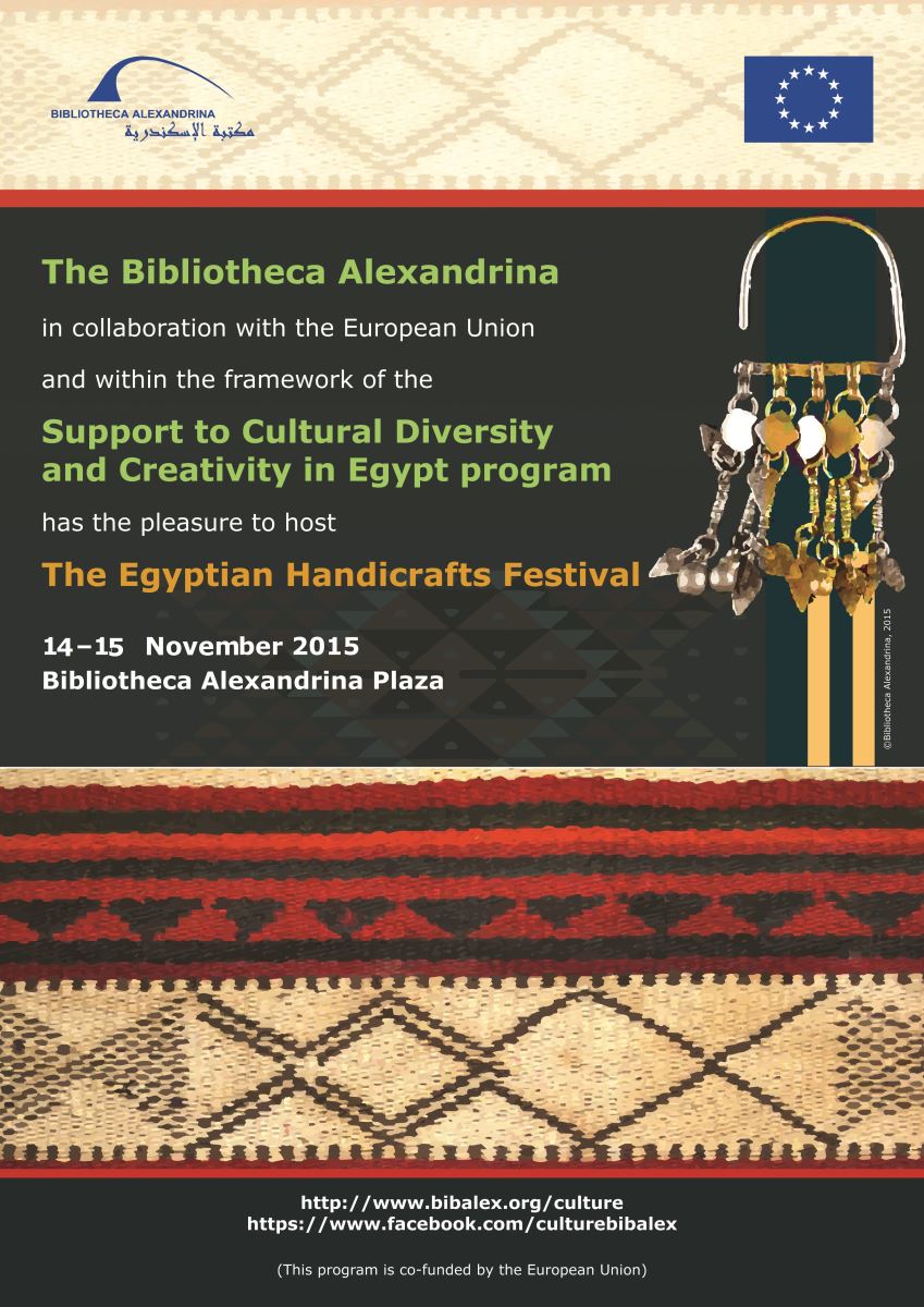 Within the framework of the Support to Cultural Diversity and Creativity in Egypt program, and the margins of the closing conference of the program, the Bibliotheca Alexandrina (BA) is organizing the 2nd round of the Egyptian Handicrafts Festival in the period between 14–15 of November 2015, at the Bibliotheca Alexandrina plaza.