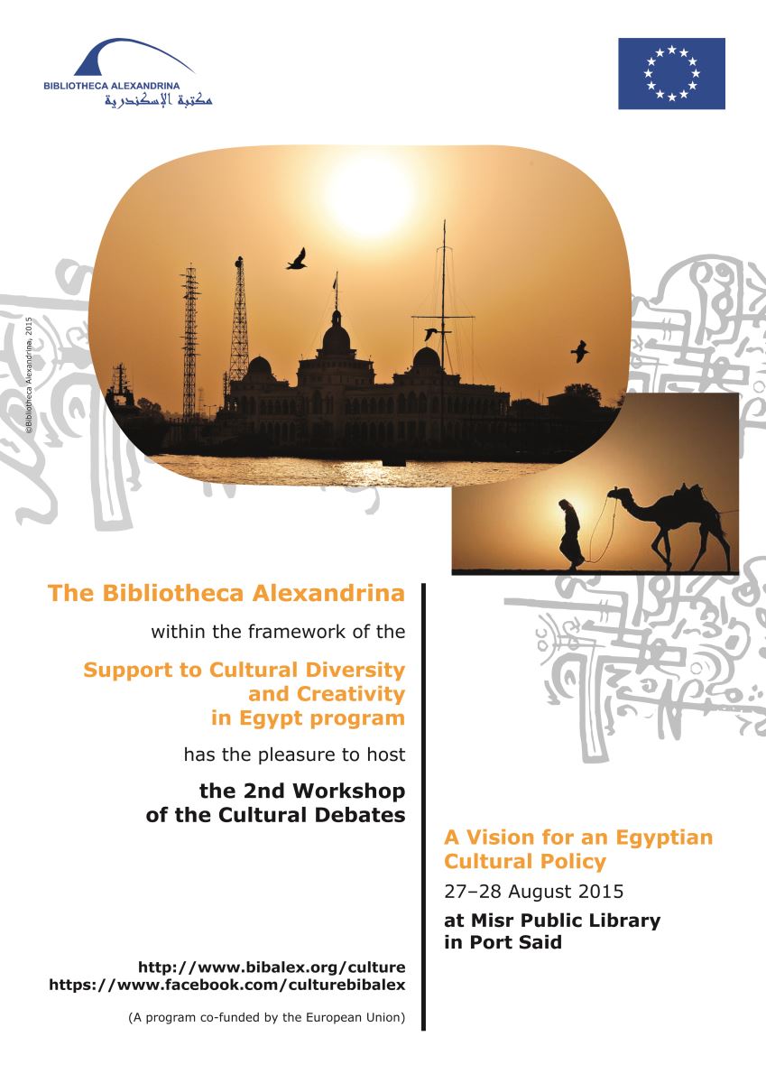 In collaboration with the European Union, and within the framework of the Support to Cultural Diversity and Creativity in Egypt program, the Bibliotheca Alexandrina (BA) is organizing a new workshop under the theme of “A Vision for an Egyptian Cultural Policy”. The event will be held between 27–28 of August, 2015 at Misr Public Library in Port Said.