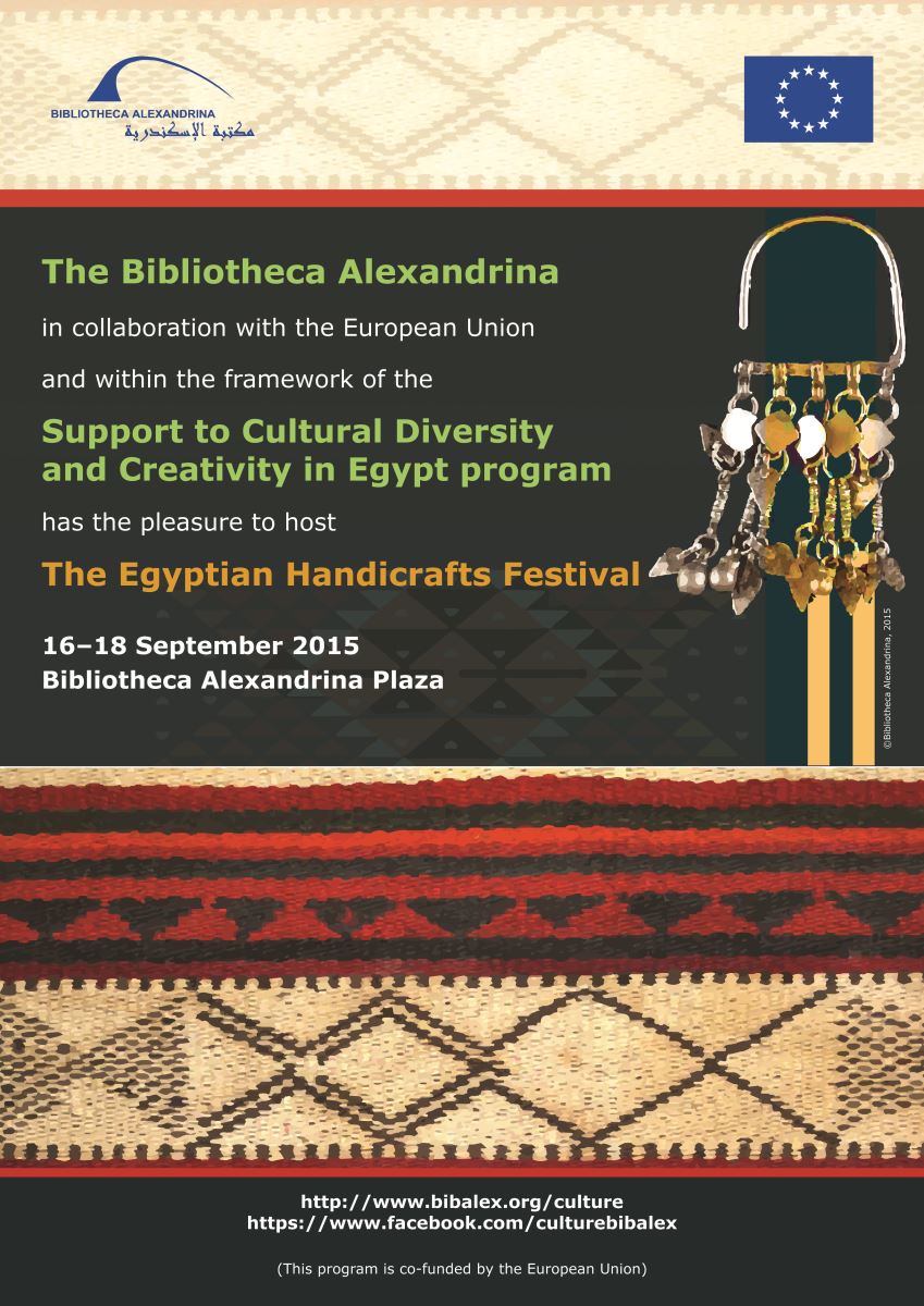 In collaboration with the European Union, and within the framework of the Support to Cultural Diversity and Creativity in Egypt program, the Bibliotheca Alexandrina (BA) is organizing a festival for Egyptian handicrafts in the period between 16‒18 of September 2015, at the Bibliotheca Alexandrina plaza.