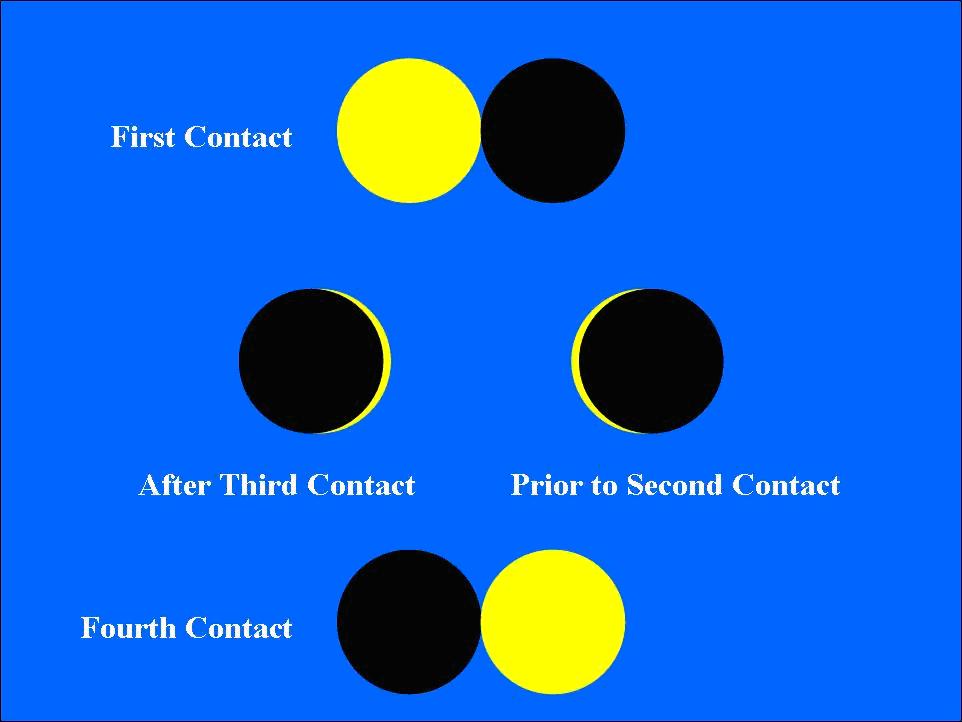 In a total solar eclipse there are four contacts between the Sun and the Moon as shown in Figure 4. Each of the four contacts marks an eclipse stage and the phenomena that occur through each stage.