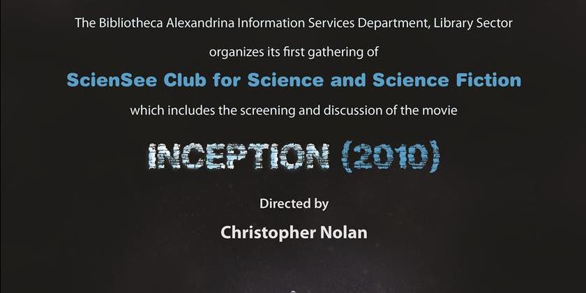 The Bibliotheca Alexandrina Information Services Department organizes its first gathering of "ScienSee Club for science and science fiction", which includes the screening and discussion of the movie Inception (2010), directed by Christopher Nolan. The film is accompanied by Arabic subtitles.