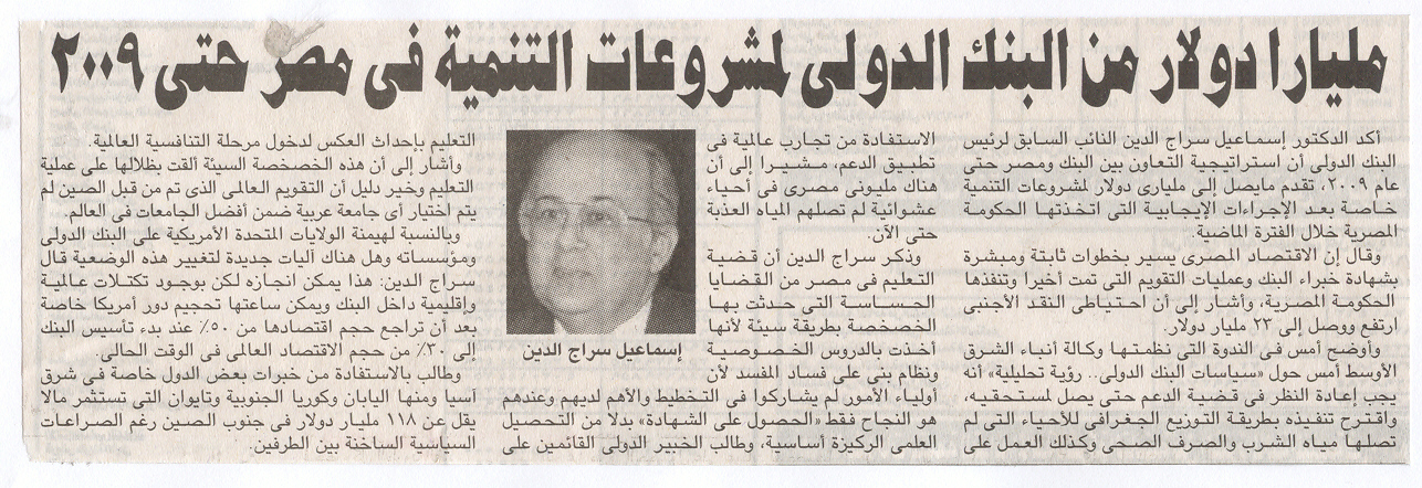 16 Aug 2006 2 Milliards Dollars from the World Bank for the Development Projects in Egypt until 2009 AL-AHRAM