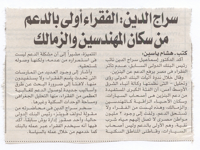 16 Aug 2006 The Poor Deserve Support More than Those Who Live In Mohandseen and Zamalek Al-Masry Al-Youm