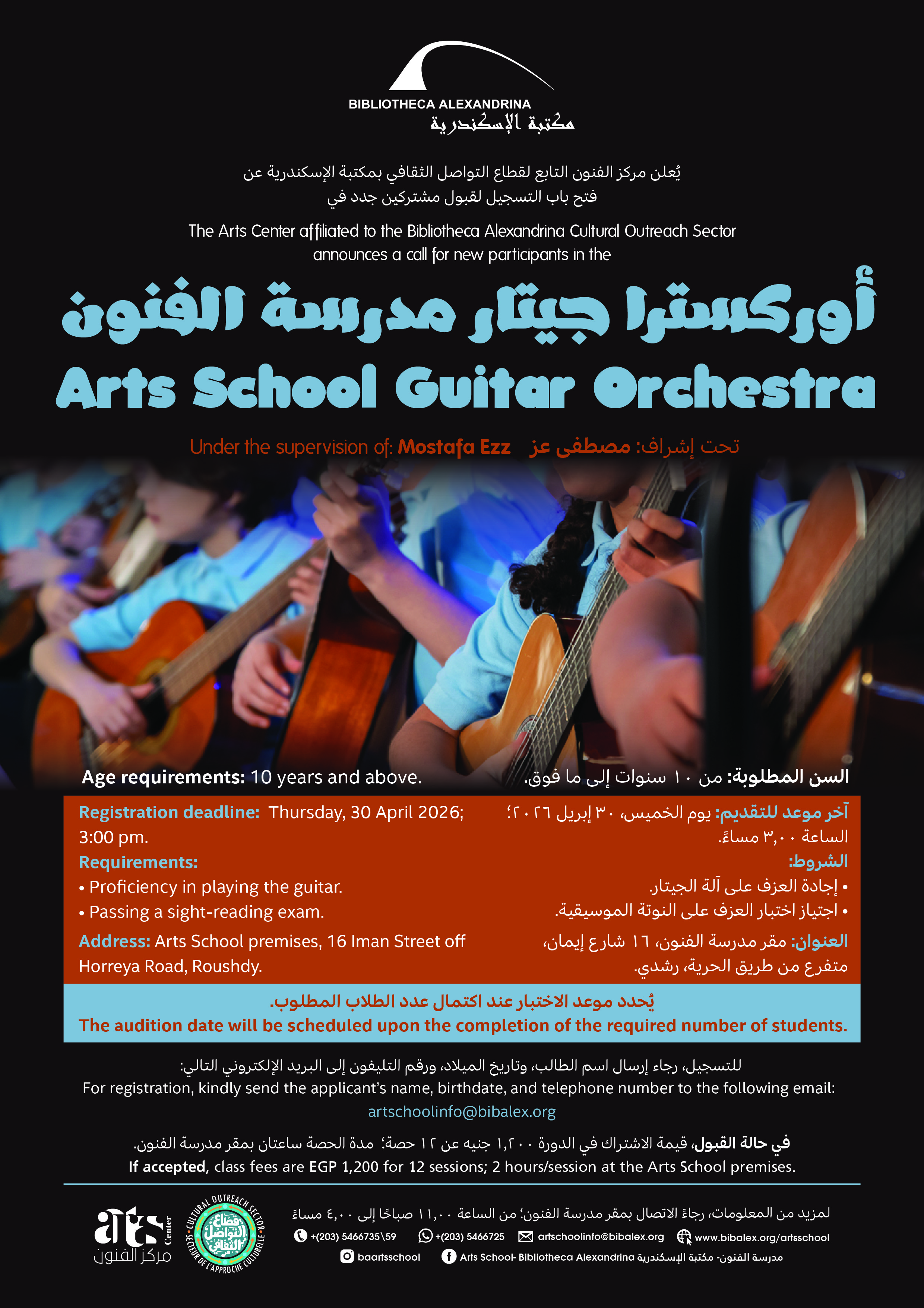 For registration, kindly send the applicant’s name, birthdate, and telephone number to the following email: artsschoolinfo@bibalex.org.