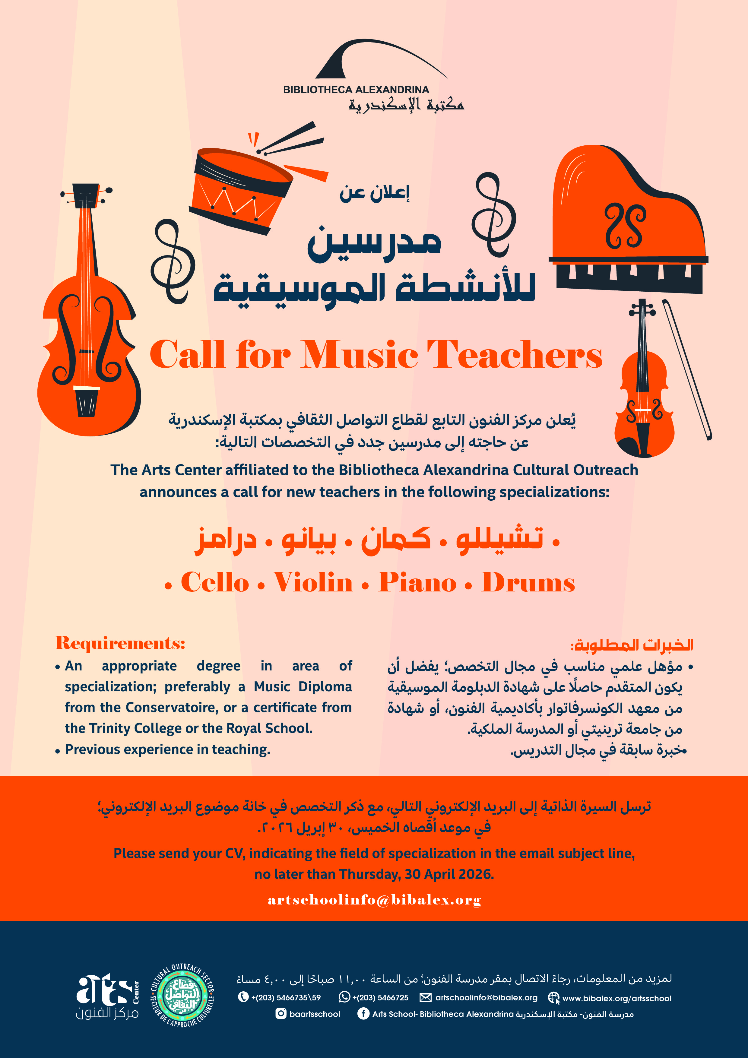 Please send your CV to artschoolinfo@bibalex.org, indicating the field of specialization in the email subject line, no later than Thursday, 30 April 2026.