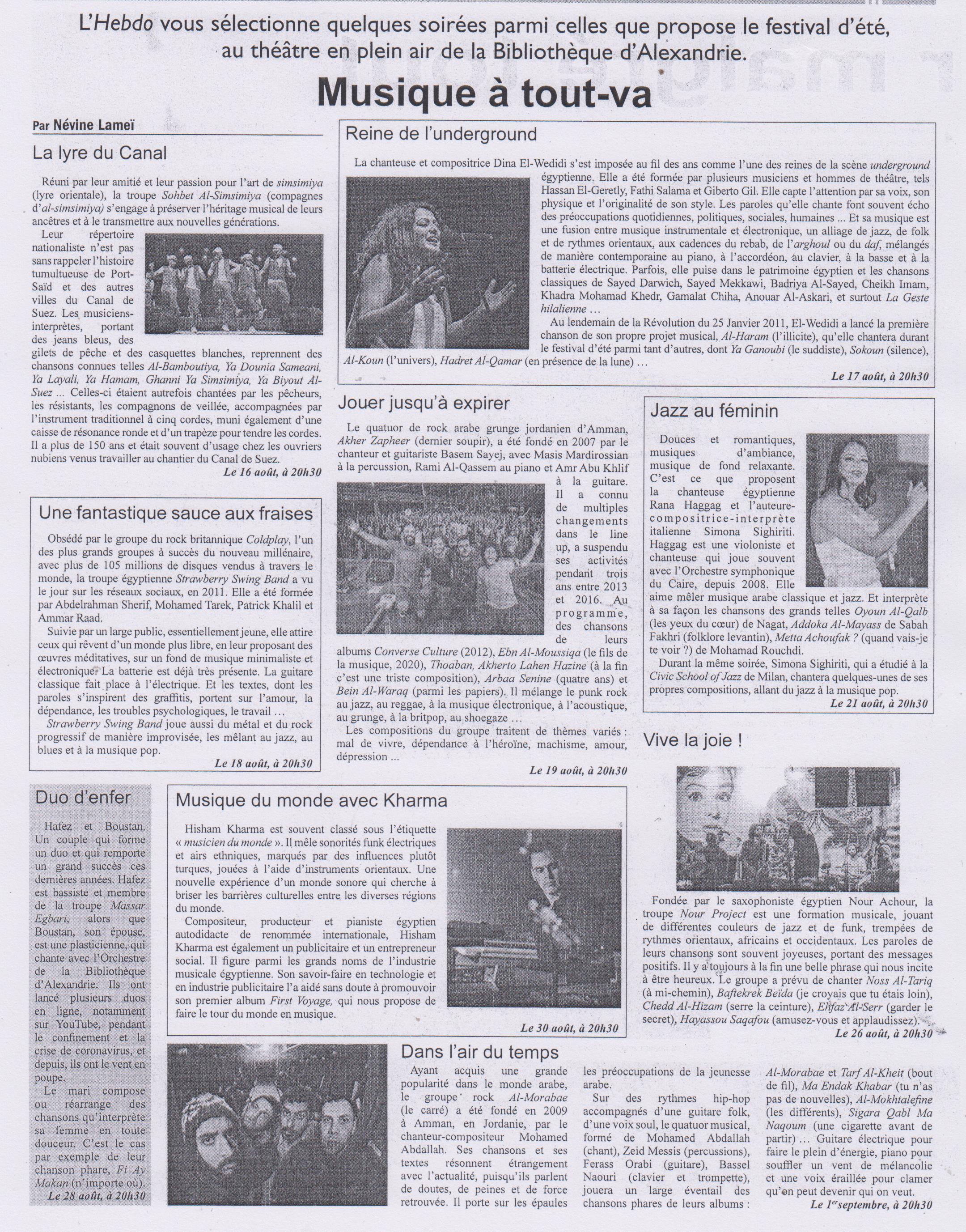 16 août 2023 L'hebdo vous sélectionne quelques soirées parmi celles que propose le festival d'été, au théàtre en plein air de la a bibliothèque Alexandrina. Al-Ahram Hebdo
