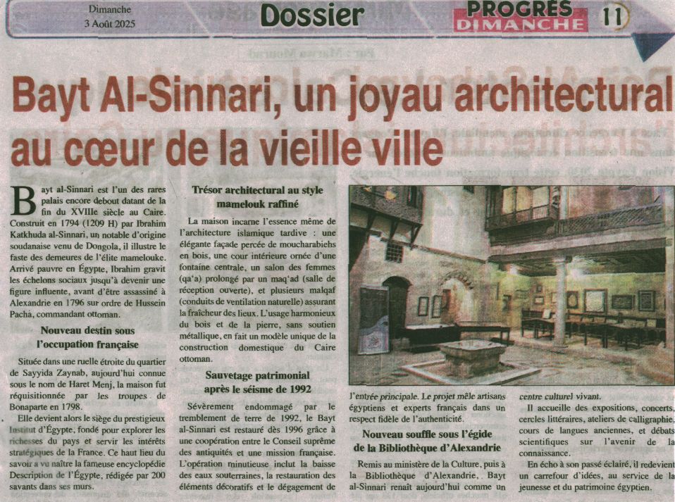 03 août 2025 Bayt Al - Sinnari , un joyau architectural au cœur de la vieille ville Le Progrès Egyptien