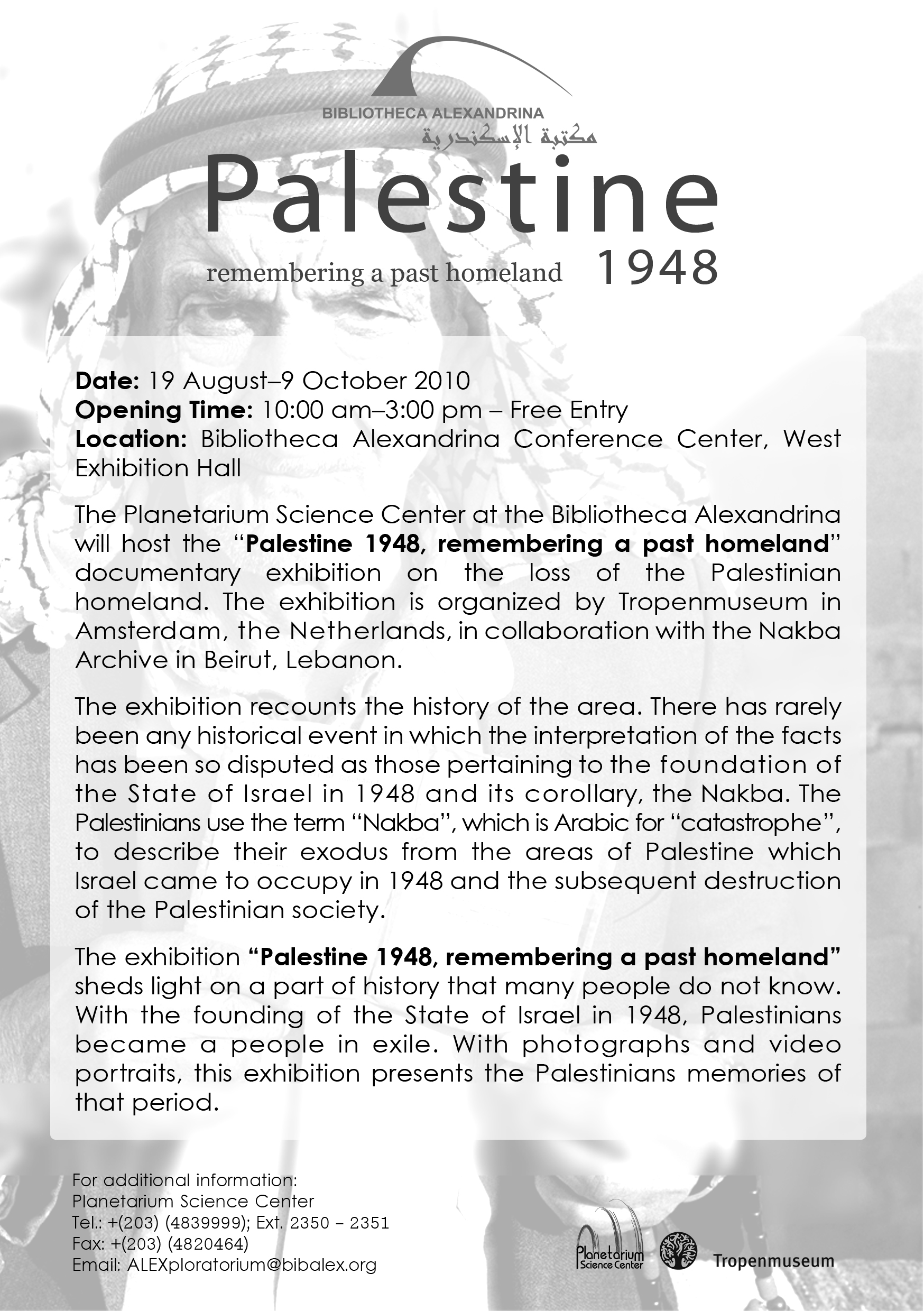 Du 19 août au 9 octobre 2010, le Centre des Sciences du Planétarium (CSP) accueille une exposition intitulée « Palestine 1948 – Mémoires d’une Patrie Perdue ».
