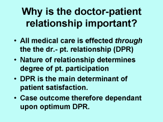 cope. This way, instead of just treating a sore throat you might prevent a suicide. Even if the patient is not depressed, they would probably appreciate your question as an expression of your interest in them as a person, and at very least leave with a much more positive opinion of you. Think for a moment about doctors you have been to see as a patient. Who was the doctor who you felt best or most happy with? What was it that made you feel that way? What about the doctor you felt least comfortable or happy with? Again, why did you feel that way about him or her? Throughout this lecture, reflect on your own experiences as a patient. |
