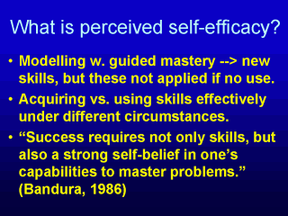 fortunately, we have not yet managed to find out how to do so very effectively. Most learning, like the kind you do when in the skills lab, involves what is called guided mastery. This is where an “expert” demonstrates the skill by modelling it, then you try to imitate that skill. The expert guides and gives feedback on your performance. While this is a good approach to acquire new skills, but if they do not work, or are not useful, the skills will not be applied, no matter how well they have been learned. There is a difference between acquiring and using skills under different circumstances. Reasearch has shown that, in addition to the skills, success also requires a strong belief in one’s capabilities to master problems - self -efficacy. |
