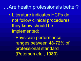 better when t comes to changing their own behaviour. Studies have shown that only between 48-72% of physician performance meets recommended professional standards of practice. |