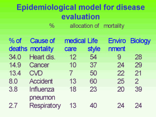 These proportions are derived from epidemiological studies which What can you conclude about the predominant sources of cause or prevention of these conditions? If we look at the fourth most important cause of death in the Usa in 1973, accidents, we see that about 85% of the variance in accident rates arises from life style and environmental factors, with biology being largely irrelevant as a contributor (2%) and subsequent medical care accounting for little more than one sixth (13%) of the variation in mortality from accidents. Other causes, like cancer,have a larger estimated contribution from biology, but less from treatment. |