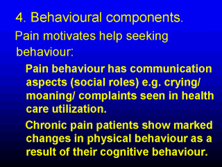 to also have a communications role, as well as a harm reduction role. These points are very logical for acute pain. But what about chronic pain? While the meaning of acute pain is that harm has occurred, the meaning of chronic pain is ambiguous - it no longer signals danger of harm because the injury has occurred several months or even years previously. It is not surprising, then, to recognize that chronic pain is particularly illustrative of the influence of factors such as cognitions and contexts on pain experience. We have also to think about the meaning of chronic pain, as this significantly influences the emotional/motivational elements of the pain experience. A benign pain, such as common chronic low back pain is not life threatening. It may be uncomfortable, limiting and frustrating, but it will not kill the sufferer. However, cancer pain, while perhaps no more intense in terms of tissue disruption than a benign pain, is usually experienced as being far more painful. The difference is in what the pain signifies. In benign pain it is a nuisance, but in malignant disease, it signifies the move towards death. This is a much more threatening situation and the emotional response will be very different. So the signaling or symbolic elements of a pain are of key importance in understanding what pain experience is. |