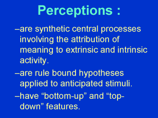 processed beyond a basic, pre-conscious level, and much is never “perceived”. One feature that seems well-established is that perceptual systems work on the basis of rule-application. In other words, there seems to be an hypothesis-testing process involved which attempts to find a “best-fit” interpretation for a particular pattern of cortical activity, whether it has a peripheral or central origin. This is particularly apparent when we look at language processing. The range of possible words that a speaker may produce is much greater than the CNS can deal with if it were to process each word as a separate randomly occuring entity. Instead, what seems to happen is that that context (topic of conversation) and rules of grammar help limit the number of choices the system has to make to recognize a particular word. But then, when a person talks to you, you don’t just hear the words, you register the meaning of what they say (see Fielding 1995, pp 14-21). The perceptual system has features that suggest incoming sensations are analyzed on a step-by-step basis, with the component parts identified then fitted together (“bottom-up processing”). However, in other circumstances, it seems the perceptual system identifies the whole object first, then checks by analyzing its component parts (so called “top-down processing”). |