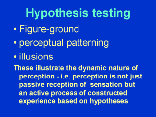 feature of the process. It is important to remember that stimuli themselves carry no meaning. They may, however, acquire a signaling role, through association with certain contingencies. The organism has a strong capacity and incentive to learn such associations (which can be more or less accurate). Through this process, abstract “flags” become attached to particular stimuli, which through repetition, come to be synonymous with the stimuli. When this happens, the stimuli have acquired “meaning”; that is, they serve some informational role. Thereafter, the flags can be manipulated (either in our heads, on paper or in computers) to model and predict outcomes. At its most basic, this is the capacity of foresight. Words and other symbols are examples of such flags. Eventually, we do not respond to the physical nature of stimuli, but to the symbolic associations, the flags, that re-present particular stimulus contigencies. Complexes of stimulus contingencies can be built up enabling complex perceptual modeling. The perceptual system then can “look for” particular complex patterns in the stimulus configurations that are constantly occurring. To detect these, a process known as hypothesis-testing occurs. Whenever the perceptual system gets a close “fit” to a particular known stimulus pattern, it fills-in the missing pieces to create the experience of the whole event, much as your web browser completes the URL you type into the browser’s address line if you’ve used the address previously. Examples of this hypothesis testing can offer partial explanations for effects such as illusions, perspective, and figure-ground phenomena. |