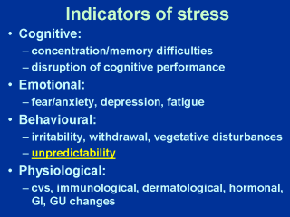 menstrual disruption, loss of libido, anxiety or palpitations, and sleep disturbances. Cognitive symptoms of stress are a feeling of being “stretched” to capacity, irritability and difficulty in attending to or concentrating on things, poor memory (as a result) and a change in social behaviour (greater need for or avoidance of affiliation). Emotional aspects of stress symptoms include a feeling of anxiety or nervousness, tremulousness, panic attacks, feeling of depression or emotional exhaustion, lack of patience or anger. Behaviourally, there may be increased irritability, increased errors or decline in performance on daily tasks, such as at work. The stressed person may become withdrawn and unwilling to interact with others, in an attempt to minimize non-essential demands. They may become less tolerant of mistakes, inefficiencies or demands from others, including family members. Their normal pattern of behaviour may change, and they may become increasingly unpredictable in their behaviour (look at the mpg web page on the slide for an amusing example of what might happen!). Physiologically, almost every system can be affected by stress. Most commonly symptoms manifest in the form of cvs, (palpitations, tachycardia or ectopics, changes in BP), GI, (stomach upset, indigestion or gas, ulcers, changes in appetite, diarrhoea, and possibly also irritable bowel, colitis and other lower GI disturbances), GU (menstrual disturbances, impotence, premature ejaculation, orgasmic dysfunction), and dermatological (eczema, acne, utricaria, possibly Lichen Planus), and immunological (increased vulnerability to infection, delayed wound healing, possibly rheumatoid and other inflammatory joint conditions, as well as immunological-mediated conditions in other systems listed above. Some research has tried to link stress to cancer onset, however, the evidence remains controversial). Most of these changes are likely mediated by changes in hormonal activity. Many patients presenting with these kinds of problems in clinics will have underlying stress. The problem is differentiating stress pre-dating from that arising as a consequence of the illness or disease. |