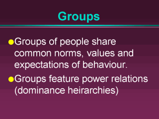 | The most important group is the family. Nuclear: two adults and their children Extended nuclear: grandparents / aunts uncles may live close by but in separate accommodation Extended. All members share the same accommodation in which a hierarchy of authority (usually) with the older / providers having greatest authority. Families, clans and tribes represent increasing groupings who provide or help one another’s members. This provides identity and requires obligations. Genes are perpetuated within a tribe or larger social group, and values (culture - maps for understanding) are concentrated. Many of the determinants of social groupings have an economic, or by one step removed, political origin to do with control of access to resources and reproduction. |