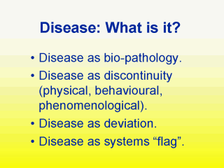 think of disease? The most common way it is conceptualized is as biological pathology - a bio-mechanical breakdown of a complex molecular or mechanical machine called a ”a patient”. This model is based on 19th Century thinking, from the era of machines; William Harvey described the heart as a pump, the lungs were seen as a gas-exchange bellows, and the laws of physics, of mechanics, describe the action of load and strain on the musculoskeletal system. These models have been extremely helpful, but we must recognise that they have limitations.From the patient ’s perspective, disease can be considered as a discontinuity, that is a change, in their life; this may be physical, but it might also be behavioural, or in terms of their subjective experience (phenomenological). This is quite different from the mechanical definition and explains a wider range of experience as “disease”.The detection of disease is often based on “abnormal” results of “tests”, such as those for blood pressure. Hypertension is defined (in some text books anyway) as a diastolic pressure (DBP) >90 mmHg on two successive occasions. Why? There is no sudden change between a person with a DBP of 88 and one of 92 mmHg. This definition, like so many for disease, is based on a statistical deviation, often based on the distance of a test value from the so-called “normal range” (which is often one standard deviation either side of the population mean score.Finally, disease can be thought of as a marker or flag of problems or developments in complex systems, indicating distortion or breaching of homeostatic mechanisms. This system view considers disease as a product of complex, stochastical systems failure (not just biological systems), which would then include events such as famine and war as “disease”. |