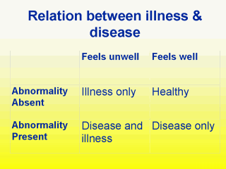 | This simple table differentiates between disease and illness. Abnormalities may be present or absent, independent of how the person feels. Illness can occur together with or independent of disease. |