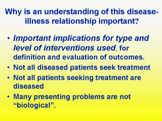 which to understand disease has important implications. 1. It influences in what way, for whom, under what circumstances and at what costs attempts are made to intervene to treat or manage disease or promote or maintain health. 2. It influences our choice of outcomes used to determine the effectiveness and efficiency of interventions we might use. A good model should not only explain histopathology, but also explain why not all people with active disease seek treatment, why not all patients seeking treatment are diseased and why many presenting problems are not biological, even though they may imply disease. The mechanistic-reductionist models of disease developed in 18th entury European are still thought by many to be adequate. However, as the shift in the emphasis that is taking place I n your medical education and on health services delivery indicate, this model may be a necessary component of a wider picture, but by itself it is not a sufficient component and any doctor failing to recognise this remains embedded firmly in an increasingly out of date view of the world. |