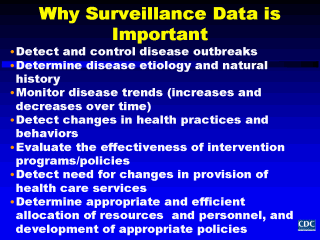 Why is surveillance data important and how can it help us? Surveillance data which is analyzed and disseminated on a regular and ongoing basis helps us know when and how to take public health action in a number of ways: - first, it helps us detect and control outbreaks of disease. For example, each year, surveillance data concerning influenza activity is disseminated to health care providers and used to determine when intensified vaccination efforts and chemo-prophylaxis should be directed to persons within the population at high risk for complications. - Analysis of surveillance data also helps us determine the etiology and natural epidemiological history of diseases, environmental and occupational exposures, and health behaviors, and increases and decreases in their occurrence over time. - Surveillance data is useful for monitoring changes in health practices and behaviors. Information concerning life-style habits is especially important for chronic diseases where trends in risk behavior(s) often precede changes in health outcomes. This type of information is necessary for helping us determine how to change the provision of health care services as life-style habits change over time. - Surveillance data also helps us evaluate the effectiveness of disease prevention, control, and treatment programs and policies at reaching at-risk populations, and informs individuals and organizations responsible for the development of these programs of the need for changes and refinements. For example, during the mid-1980’s, the incidence of measles within the United States began to increase as a result of outbreaks occurring within school-aged and inner-city preschool populations. These findings lead to the adoption of a policy to require two, rather than just one, dose of measles, mumps, and rubella vaccine for all children prior to school entry, and to targeted efforts to have private and public vaccination providers improve on-time vaccination rates among pre-school children. And it’s important to remember that surveillance data can help us determine the most appropriate and efficient allocation of resources and personnel, which in turn, helps us establish good public health policies. In general, surveillance data is important for informing us when and how to take appropriate public health action when it is needed. |