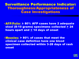 | The third type of surveillance performance indicator focuses on assessing the thoroughness and appropriateness of case investigations. In the case for AFP and measles surveillance, the performance indicators define more specifically the appropriate amounts, types, and time periods in which laboratory specimens should be collected from suspected cases in order to ensure the highest likelihood that the source of infection can be thoroughly investigated and identified. |