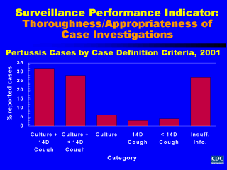 Let’s see how applying aspects of the case definition for pertussis can inform us about the thoroughness and appropriateness of the case investigation process for a pertussis surveillance system. First, let’s assume that the case definition for pertussis is: A cough illness lasting at least 2 weeks with paroxysms of coughing, inspiratory "whoop", or post-tussive vomiting without other apparent cause. Laboratory criteria for diagnosis and confirmation of pertussis disease include isolation of B. pertussis from a clinical specimen, or positive polymerase chain reaction (PCR) assay for B. pertussis. In this graph, data concerning the cases of pertussis reported to our surveillance system have been classified according to combined information on laboratory testing and cough duration needed to rule in or out a confirmed case of pertussis disease. As the data summary reveals, adequate laboratory and cough duration information was collected to determine the case status for 60% of cases. Of concern, is the 6% of suspected cases for which a culture but not information on cough duration was obtained, the 7% of suspected cases for which cough duration but not a culture was obtained, and the 27% of suspected cases for which there was insufficient information concerning cultures and cough duration. Theses findings suggested that our surveillance system needed improvement, particularly regarding collection of cultures and cough duration information during case investigations. By looking at other elements (e.g., completeness and timeliness of case reporting; date of onset, duration, and type of other clinical symptoms; number of case contacts identified and treated in order to prevent or limit the spread of disease; vaccination history information including dates of vaccination, and vaccine type, manufacturer, and lot number), we can identify additional areas where surveillance for pertussis disease can be improved. As before, the types of performance indicators used to assess surveillance for infectious and vaccine-preventable diseases can also be used to assess practices and procedures focused on surveillance of exposures to environmental and occupational toxicants. Performance indicators used to assess surveillance for chronic diseases and injuries could focus on thorough and appropriate collection of information concerning participation in behaviors which reduce and/or increase risk for development of disease or occurrence of accidents. |