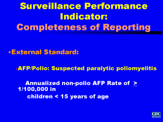 Now that we are aware of some of the reasons why all actual cases of disease may not be reported to our surveillance system, let’s review of the surveillance performance indicators which can help us determine how complete our case reporting actually is. There are several types of surveillance performance indicators which can be used for this purpose. The first type of indicator is an external standard, or an indirect measure of incidence for the disease of interest. An example of this type of indicator is the annualized non-polio incidence for acute flaccid paralysis, or AFP, observed among children less than 15 years of age. As part of the effort to eradicate poliomyelitis, this surveillance performance indicator has been adopted by countries in which wild poliovirus is still endemic to assess their completeness of reporting of suspected cases of wild poliovirus infection. While we are actually interested in completeness of reporting for cases of wild poliovirus infection, such cases are hard for health care providers to identify and clinically diagnose directly. Instead, we conduct surveillance for a condition, AFP, which is much easier to detect clinically, and ask health care providers to report these cases to our surveillance system. We know that even in the absence of paralysis due to wild poliovirus infection, the baseline incidence of AFP due to Guillain-Barre Syndrome and other causes is fairly constant over time, i.e., at least one case per 100,000 children under 15 years of age. When countries or regions achieve reported AFP incidence at or exceeding this level even in the absence of any laboratory confirmed or clinically compatible AFP cases due to wild poliovirus infection, we can be reasonably confident that the absence of reported poliomyelitis in fact means there is no wild poliovirus circulating. We know our surveillance efforts are being conducted with sufficient intensity to be able to detect any cases of infection should they actually be occurring. If AFP rates within a region or country are less than one per 100,000 children under 15 years, we cannot be certain if the absence of reported cases of poliomyelitis is due to a true absence of wild poliovirus circulation or inadequate surveillance efforts. In this situation, we would track AFP surveillance at the regional and national level, identify areas with inadequate surveillance, and make improvements in the surveillance system so that AFP incidence rates met or exceeded one per 100,000 in children under 15 years of age. Looking at external standards helps us realize when our surveillance efforts need to be intensified or improved. After cases of AFP clinically consistent with poliovirus infection are reported to the surveillance system as suspected cases of poliomyelitis, laboratory testing of stool samples occurs to rule in or out wild poliovirus infection. For cases in which adequate laboratory testing is not obtained for this purpose, they are classified as compatible with poliovirus infection and thus, not included in the calculation of the non-polio AFP rate. These circumstances are considered a failure of case investigation and surveillance. |