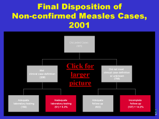 Among the 1100 suspected cases of measles reported to our surveillance system in 2001, 965 were eventually discarded because they could not be confirmed as actual measles cases. If we look at the different reasons why these suspected cases were discarded, we see that for the 206 which met the clinical case definition for measles, 155 were eventually discarded because laboratory testing revealed they were not cases of measles. In addition, of the 759 suspected cases which did not meet the clinical case definition for measles or had an unknown status, 622 cases were eventually discarded because follow-up case investigations revealed information that indicated these were not actual cases of measles. While our surveillance system was able to determine the status for approximately 80% of our suspected cases, it did not provide laboratory testing for 51 cases (5.3%) or follow-up investigations for 137 cases (14.2%) adequate to determine their confirmatory status. This suggests that our surveillance system needs to improve both its laboratory testing and investigative capacities. As we can see, examining the disposition of discarded cases helps us understand how well our surveillance system is performing. The limitation of this approach is that it requires collecting a lot of information on cases that ultimately are ruled out, which some might consider an inappropriate use of limited resources. Nonetheless, when this information is available, it provides some assurance that cases are being suspected, reported, and appropriately investigated. |