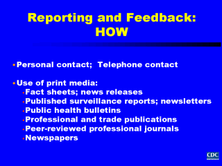 Now that we’ve talked about some of the groups who should receive feedback on surveillance information and the kind of information that would be useful to them, let’s talk about some of the ways in which you can provide this information. Providing information during visits to health care providers' offices, schools, worksites, and other settings is particularly effective as the individual interaction and opportunity for face-to-face communication allows people to receive immediate feedback to questions and concerns. Telephone calls to these same settings can serve a similar function. Given that it is difficult and time consuming to make in-person visits and/or telephone calls to all the individuals and groups who provide you with surveillance data, alternative means of information dissemination can be used as well. Traditionally, different forms of print media have been used. These include: - fact sheets and news releases, - published surveillance reports and newsletters of local and state medical and public health societies, - public health bulletins, - professional and trade publications, - professional journals, and newspapers. |