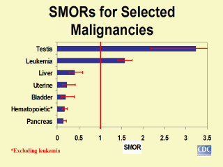 With the exception of malignancy of the testes and leukemia, SMORs for the major classes of malignant neoplasms were significantly lower than expected. For example, the SMORs for liver, uterine, bladder, hematopoietic (excluding leukemia), and pancreas cancer were all less than 0.5. We found an SMOR for testicular cancer of 3.2, a finding consistent with previous studies suggesting that testicular cancer is unusually frequent among men with Down syndrome. |