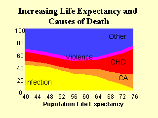 疾病的形態相當明顯地依循預期壽命的變化。請看圖示:目前全世界人類的預期壽命為六十五歲,並持續延長中,看一看二十一世紀的主要健康問題會是什麼?