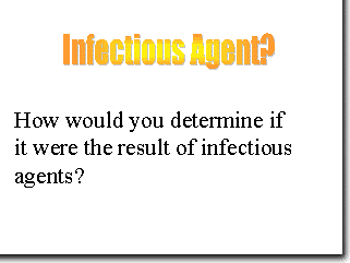 Evaluation of evidence for an infectious agent is done by examining the disease population to see if the patterns of disease match that of known infections. It is also done within individuals to find antibodies to known agents. |