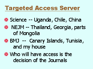 The GHNet has begun to approach the journals to bring the journals into developing countries. This can only be done electronically. A targeted access server allows the journals to provide information to developing countries, without giving access to developed countries. |