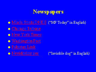Plenty of renowned newspapers can be found on the Internet. They can be divided into two groups. The first group covers the newspapers which exist in a paper form and are converted into an electronic form. The second group covers the newspapers which exist only on the WWW and therefore which are not distributed in a paper form (see the last example on this slide). |