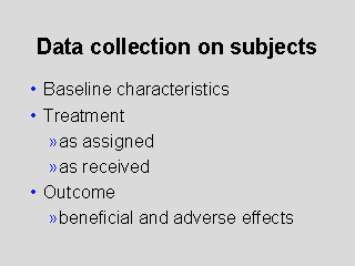 在臨床試驗,數據收集是依據事前已明確且詳細說明的標準來進行。 對於所有不同治療組別之所有的病人,其測量的方法、 預定時間表、 和應用標準皆必須是一致的。 在對患者做隨機取樣前,其基礎的特性須先被測量, 以期知悉治療分配不能影響基礎特性的報告。 監測所有病人的治療是重要的, 不論是被分配的治療或最後所接受的治療 (因為並不是所有的患者皆會依據隨機分配所分配到的治療方式接受治療)。 有些病人可能會拒絕所分配的治療方式; 在藥物試驗中, 有些病人不會完完全全順從指示, 而只服用部份被指示的藥物。 例如計算藥丸 ( 或更高科技的方式) 的方法對於評估有關服從所指示的治療法的程度是有用的。 “結果” 是分析治療效果所依據的因素。 為了確定新的治療方式是否為“較好的”,評判所依據的標準,主要的結果,必須在事前做詳細的說明。 同樣地,為了獲得有關新治療方式的好處和危險的更完整的狀況, 其他結果,不論是所期望的或不期望的,一般都要受評價。