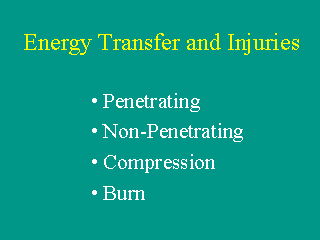 If the energy transfer is localized in one area, the likely outcome may be a penetrating injury. If the energy transfer is dispersed over a broad area, the result will often be a non-penetrating injury. In situations involving thermal energy transfer, the result will be a burn. And so on, depending upon the mode of energy involved. |
