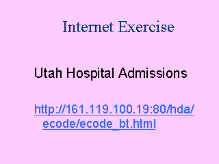 One may find an example of data from a medical database by browsing through the homepage on hospital admissions in the state of Utah. The key to identifying injuries at this site is the use of E-codes. Try to find the number of events related to child abuse (E-code 967) in the search query for the database. |