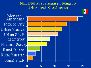 Populations that have a more traditional lifestyle (usually rural populations) have a lower prevalence of NIDDM when compared to populations that have a more "modern" one (urban). This is shown here with data from Mexico. |
